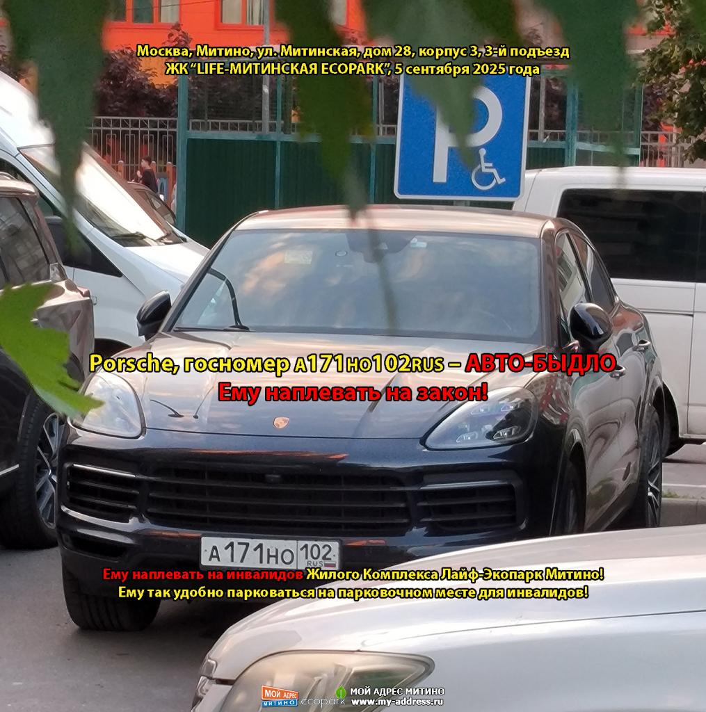 Porsche, госномер А171НО102RUS – АВТО-БЫДЛО. Ему наплевать на закон! Ему наплевать на инвалидов Жилого Комплекса Лайф-Экопарк Митино! Ему так удобно парковаться на парковочном месте для инвалидов! Москва, Митино, ул. Митинская, дом 28, корпус 3, 3-й подъезд ЖК “LIFE-МИТИНСКАЯ ECOPARK”, 5 сентября 2025 года