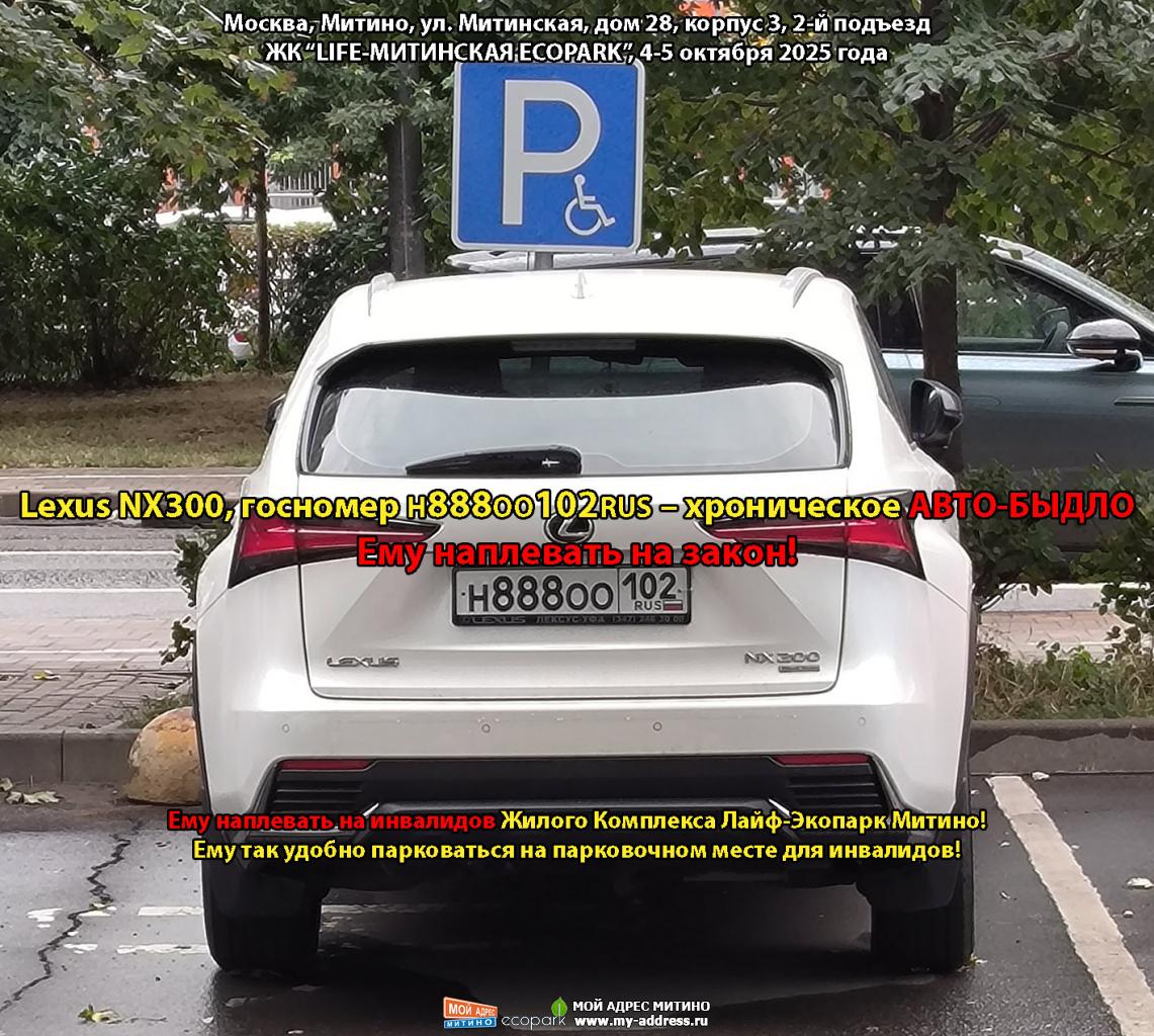 Ему наплевать на закон! Ему наплевать на инвалидов Жилого Комплекса Лайф-Экопарк Митино! Ему так удобно парковаться на парковочном месте для инвалидов! Москва, Митино, ул. Митинская, дом 28, корпус 3, 2-й подъезд ЖК “LIFE-МИТИНСКАЯ ECOPARK”, 4-5 октября 2025 года
