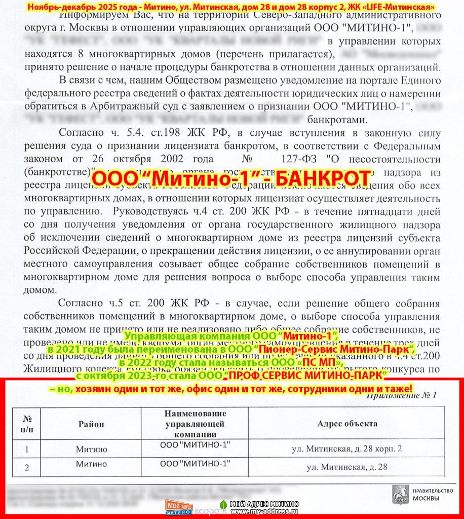 Управляющая компания Митино-1 банкрот! 2025 год, Управляющая компания ООО “Митино-1”, в 2021 году была переименована в ООО “Пионер-Сервис Митино-Парк“, в 2022 году стала называться ООО «ПС МП», с октября 2023-го стала ООО “ПРОФ СЕРВИС МИТИНО-ПАРК” – но, хозяин один и тот же, офис один и тот же, сотрудники одни и таже! Ноябрь-декабрь 2023 года - Митино, ул. Митинская, дом 28 и дом 28 корпус 2, ЖК «LIFE-Митинская»