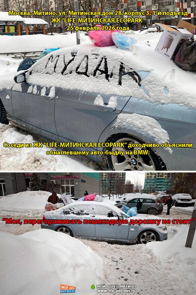 обнаглевшему авто-быдлу на BMW: “Мол, перегораживать пешеходную дорожку не стоит”. Москва, Митино, ул. Митинская дом 28, корпус 3, 1-й подъезд, ЖК “LIFE-МИТИНСКАЯ ECOPARK”, 25 февраля 2026 года